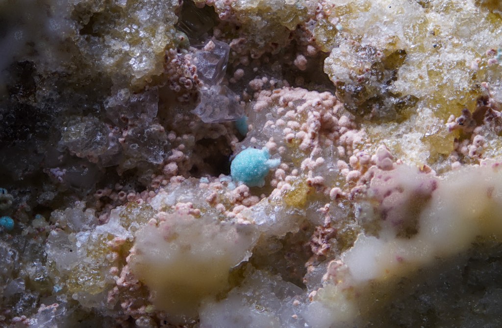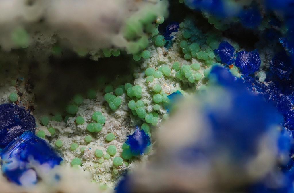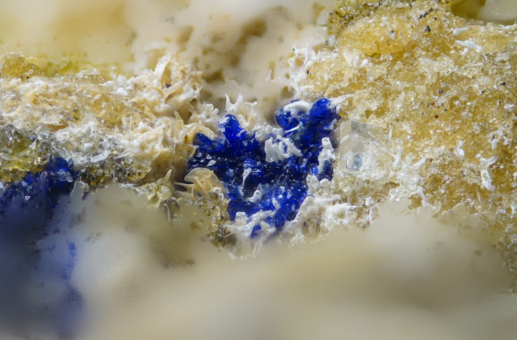 Aurichalcite的IMA化学式(Zn,Cu)5(CO3)2(OH)6,为锌矿氧化带的典型次生矿物。化学上,aurichalcite可以通过混合NaHCO3溶液和含有Zn2+和Cu2+的溶液制得。当Zn2+占比小于大约25%时会开始生成rosasite,而Zn2+达到100%时会生成hydrozincite。有意思的是,hydrozincite的化学式是Zn5(CO3)2(OH)6,但它不是aurichalcite的锌端元。它们具有不同的结构。形成aurichalcite和hydrozincite的界限并不清楚,但是应当在Zn2+占比90%以上。Smithsonite的结晶条件比aurichalcite和hydrozincite更酸性一些。在79 Mine,aurichalcite和smithsonite经常共生在一起。