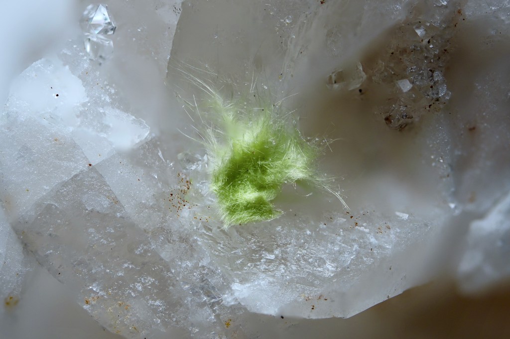 - Flourite main stage:这个阶段发生在约143±2百万年前,形成了萤石脉,主要矿物是萤石、石英和氟镁石 (sellaite),又引入了黄铁矿、黄铜矿、赤铁矿以及“fahlore”。