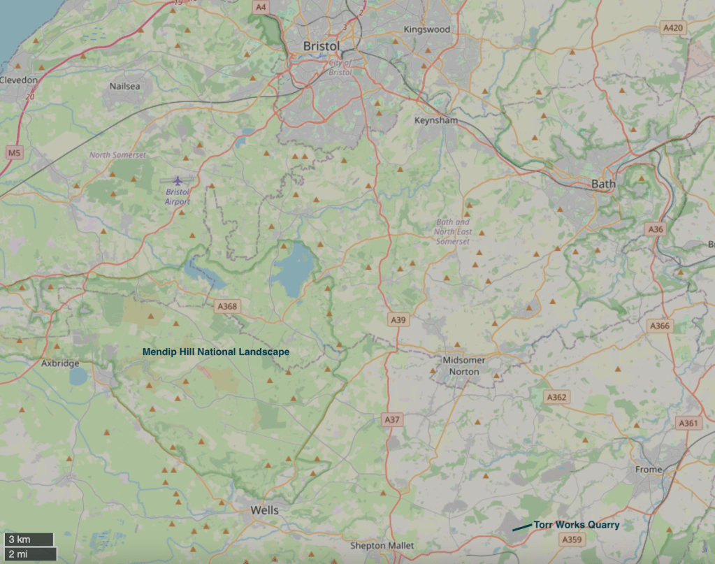 Mendip Hills是位于布里斯托 (Bristol) 南部约20 km的一系列石炭纪石灰岩小山丘。这个区域的铅锌矿开采可以追溯至罗马人到来之前,迄今已有大约两千年的历史。公元43年罗马征服不列颠后,罗马帝国的铅供应有相当一部分来自这一地区。尽管如此,矿物学家对这一地区的矿物种类了解并不多,这是因为在矿物学发展起来之前大多数矿都已经被采空了。现今Mendip附近出产数十种矿物的高品质标本,更是至少10种矿物的模式产地,其中包括mendipite (Pb3O2Cl2)、chloroxiphite (Pb3CuO2Cl2(OH)2)、diaboleite (CuPb2Cl2(OH)4)、mereheadite (Pb47O24(OH)13Cl25(BO3)2(CO3)) 等铅、铜矿物。