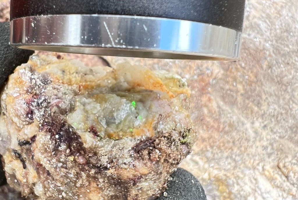 - Gummite:石英上的黄色至棕黑色粉末,约1平方厘米大小,盖革计数器测得辐射约为0.5 μSv/h。